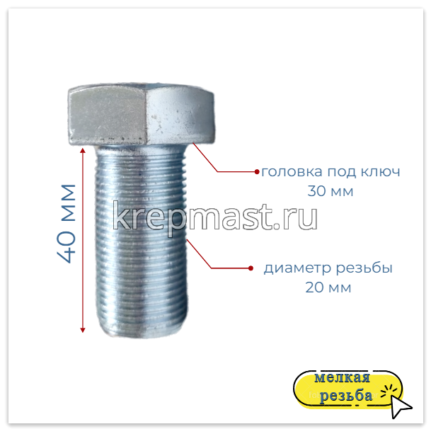 Болт DIN 961 20х 40х1,5 кл.пр. 10,9 ОЦИНК. п/р с мелкой резьбой в интернет-магазине «Мастер Крепежа» по цене 390 руб. Более 6 наименований товаров в наличии в категории Болты 20мм с мелкой резьбой. Купить болт din 961 20х 40х1,5 кл.пр. 10,9 оцинк. п/р с мелкой резьбой в Казани выгодно Вы можете on-line на нашем сайте, или отправив заявку по почте, а также по телефону или в пункте выдачи компании г. Казань, ул. Татарстан, 9, магазин "Мастер Крепежа". Доставка по Республике Татарстан и другие регионы РФ.