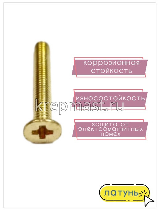 Винт латунный с полукруглой головкой DIN 965 М 3 х 20 используется в случае, когда необходимо создать немагнитный узел. Латунный винт применяется в приборостроении, авиации, атомной промышленности. Латунный крепеж стоек к органическим кислотам и углекислым растворам.