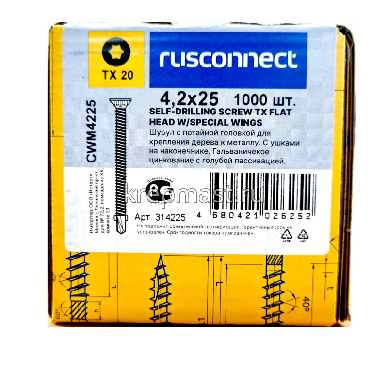 Саморез кровельный ТХ20 с ушками без шайбы DIN 7504 P 4,2х25 потай. - сверло оцинк. Rusconnect применяется для крепления деревянной доски к металлической обрешетке. На острие самореза находится бур с двумя выступающими "ушками", которые свободно проходят через древесину и обламываются, когда саморез достигает металла. На нижней стороне потайной головки есть несколько выступов предназначенных для самозенковки и аккуратного утапливания заподлицо с поверхностью. Помимо досок данными саморезами можно крепить фанеру, ДСП и плиты МДФ.