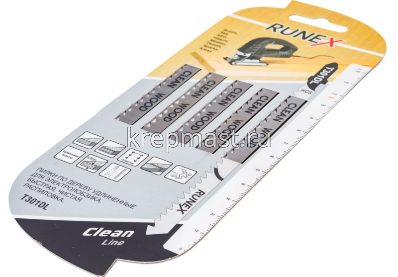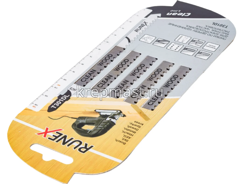 Пилки для электролобзика RUNEX Т 301 DL 132мм подходят для быстрого распила дерева и фанеры, толщиной от 8 до 60 мм.