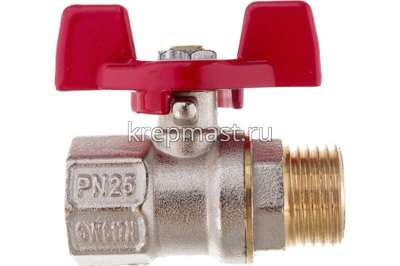 Шаровой для воды 1/2" ВР/НР ручка-бабочка, латунный предназначен для использования в качестве запорной арматуры в составе водопроводов хозяйственно-питьевого назначения. Подходит для температуры транспортируемых сред от -20 до +150 °C. Изделие изготовлено из латуни ЛС59-1 методом горяче-объемной штамповки.