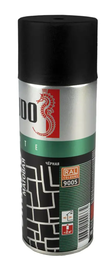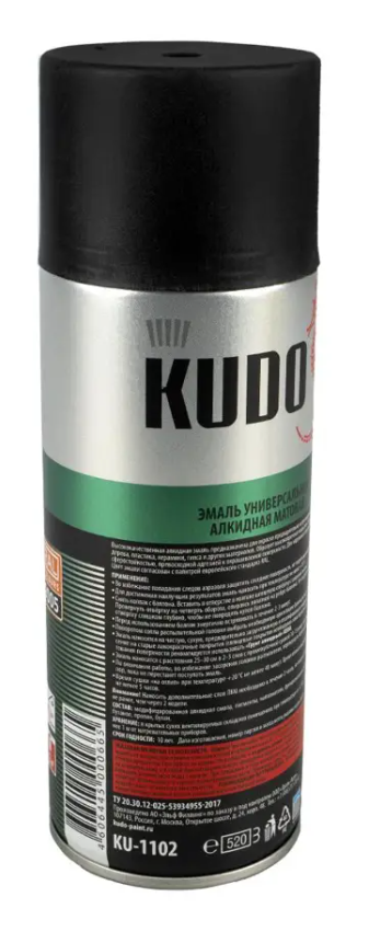 Краска KUDO черная RAL 9005 матовая - высокопрочная универсальная матовая аэрозольная эмаль в баллончике, предназначенная для окраски предварительно загрунтованных металлических и деревянных поверхностей. Аэрозольная краска легко наносится на труднодоступные места. Образует долговечное покрытие с хорошей укрывистостью, атмосферостойкостью, превосходной адгезией к окрашиваемой поверхности. Применяется для наружных и внутренних работ.