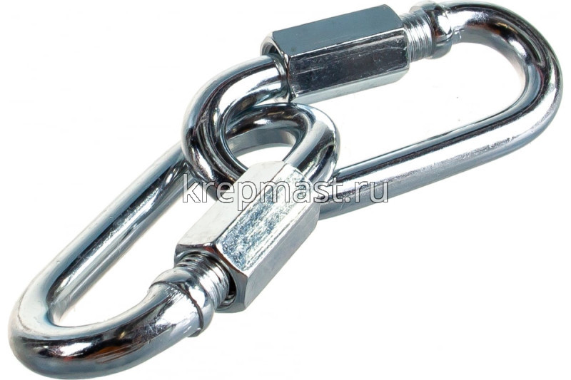 Соединитель цепей с гайкой 8 х 58,0 (карабин винтовой) - cтальной карабин "звено цепи" с винтовой муфтой (фиксатором) применяется для быстрого и надежного крепления тросов и цепей между собой или к чему-либо. Размер карабина определяется по диаметру поперечного сечения проволоки (прутка) и составляет 8 мм.
